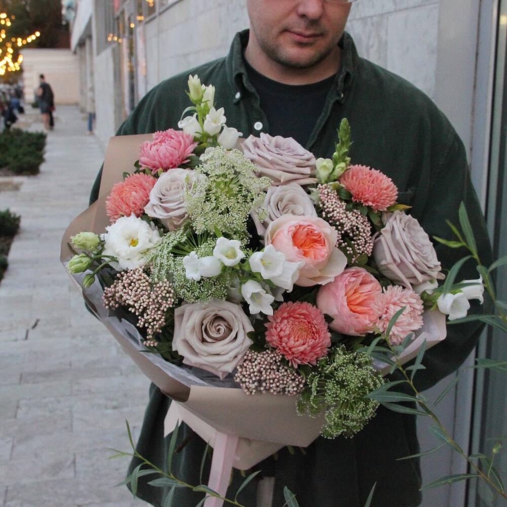 Роза пионовидная – 2 шт.Роза Мента – 3 шт.Астра – 4 шт.Озотамнус – 3 шт.Амми – 3 шт.Львиный зев – 1 шт.Колокольчик – 3 шт.Лизиантус – 1 шт.Фисташка – 3 шт.Упаковка – 1 шт.Лента – 1 шт.