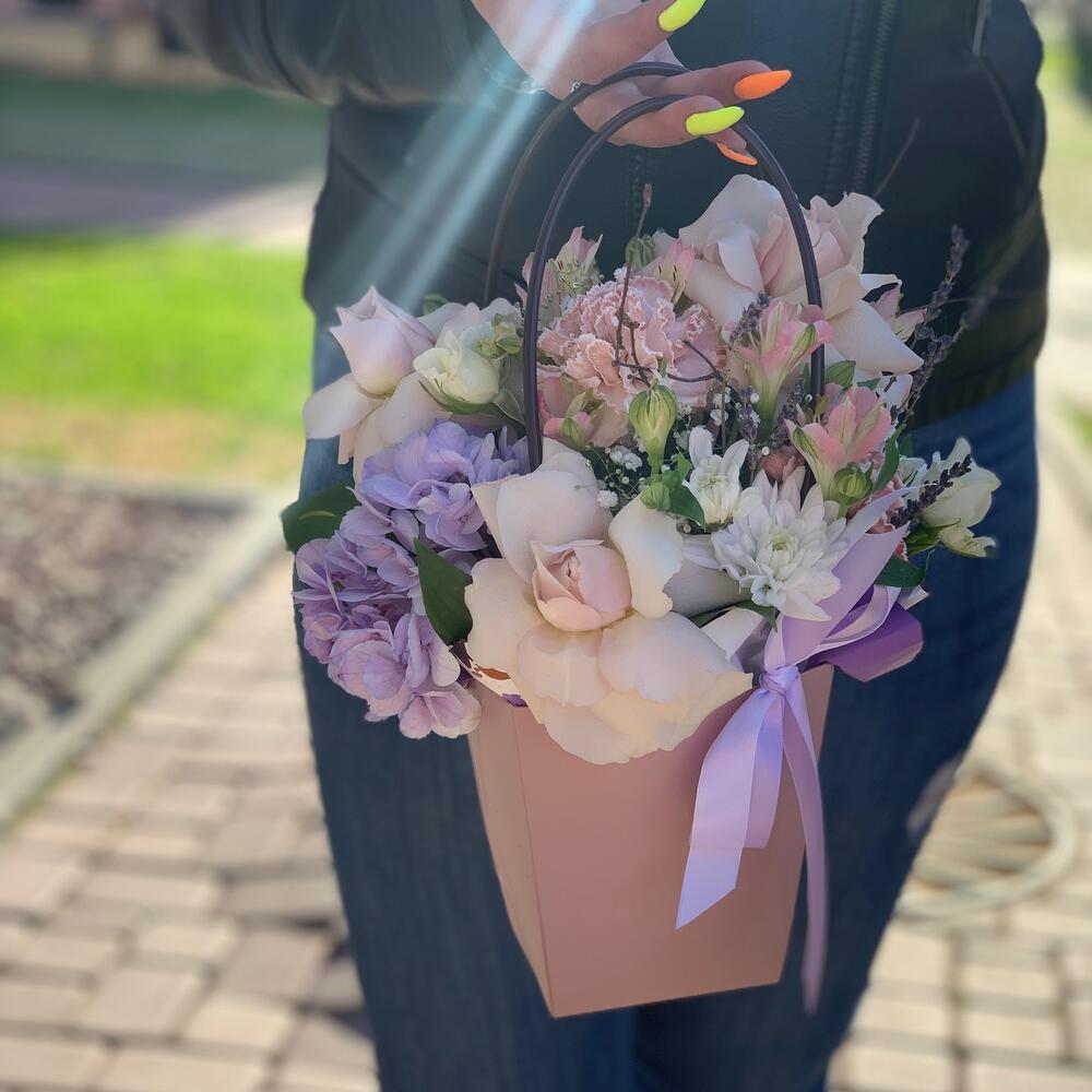 Роза – 3 шт.Гортензия – 1 шт.Гвоздика одноголовая – 3 шт.Хризантема кустовая – 1 шт.Лаванда (сухоцвет) – 9 шт.Оазис флористический – 1 шт.Сумочка – 1 шт.