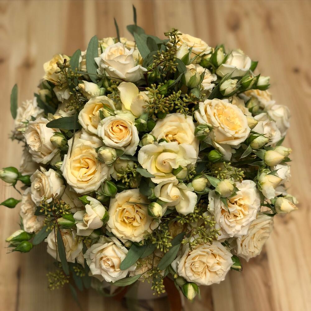 Роза кустовая – 11 шт.Эвкалипт – 3 шт.Шляпная коробка с лентами – 1 шт.Оазис флористический – 1 шт.Упаковка дизайнерская – 1 шт.