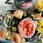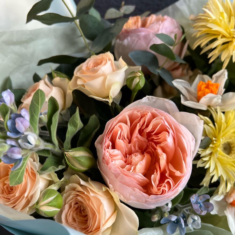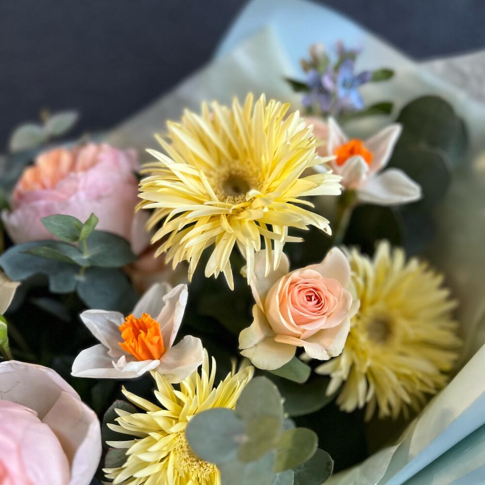 Гербера – 3 шт.Оксипеталум – 3 шт.Нарцисс – 3 шт.Кустовая роза – 2 шт.Пионовидная роза – 2 шт.Эвкалипт – 5 шт.декоративная упаковка – 1 шт.Атласная лента – 1 шт.