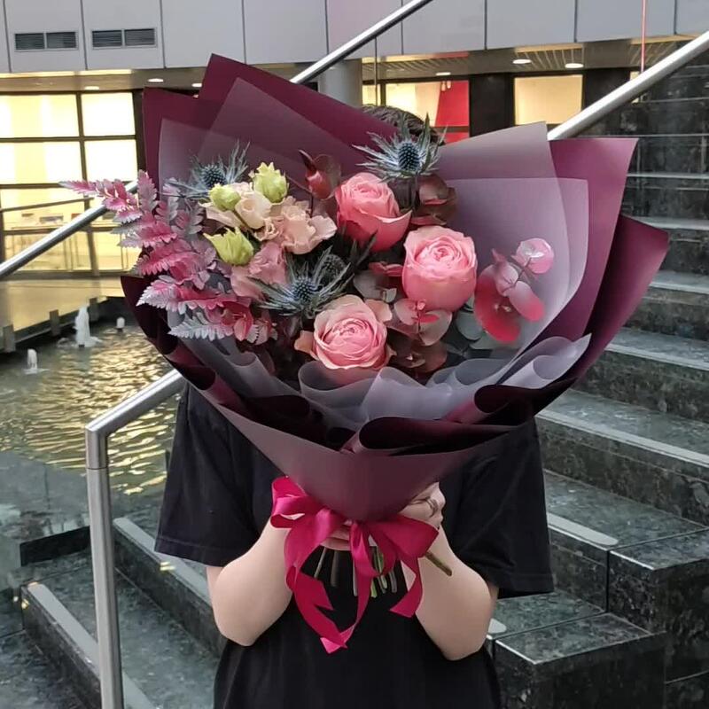 кахала роза пионовидная – 3 шт.Эрингиум синий – 1 шт.эустома персиковая – 1 шт.Эвкалипт – 1 шт.