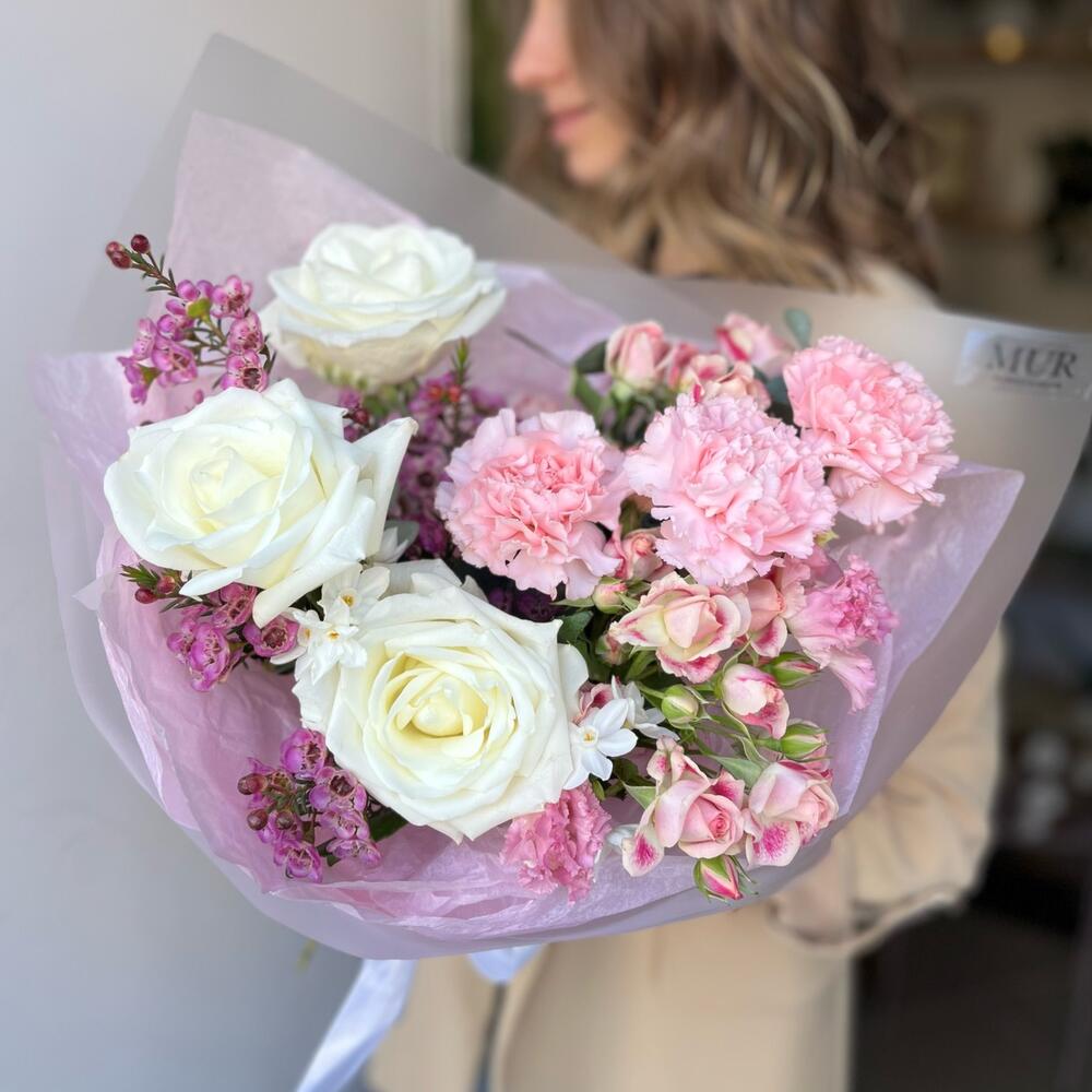 Диантус сортовой – 3 шт.мондиаль роза – 3 шт.Хамелациум – 2 шт.кустовой нарцисс – 2 шт.Роза кустовая – 2 шт.Эвкалипт Микс – 2 шт.Упаковка дизайнерская – 3 шт.Лента атласная – 1 шт.эустома алиса пинк – 1 шт.