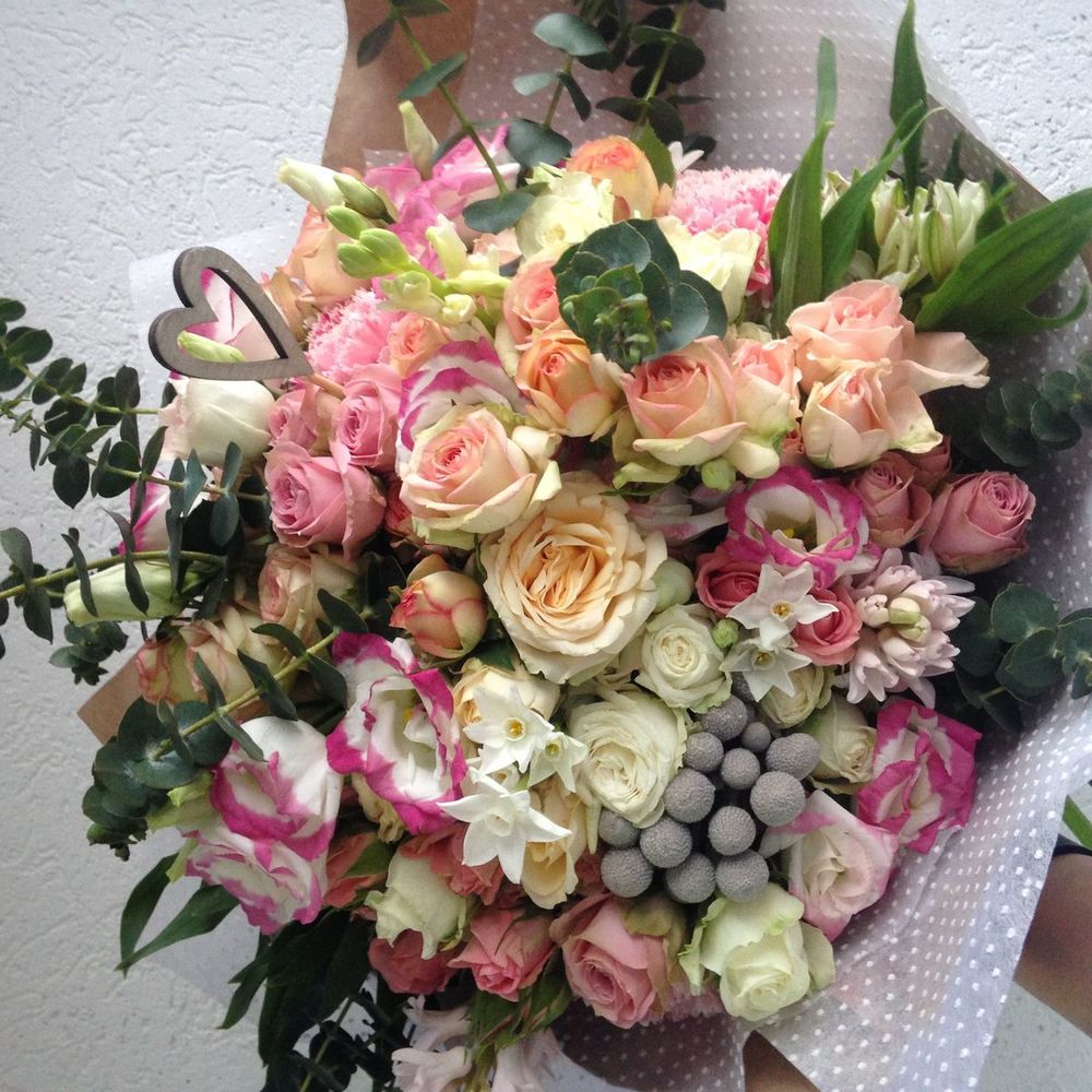 Капс Бруния Сильвер – 2 шт.Лизиантус бело-розовый – 2 шт.Эвкалипт Baby Blue – 1 шт.Роза эквадор 40 см – 3 шт.Роза кустовая 40 см – 2 шт.Гиацинт – 3 шт.