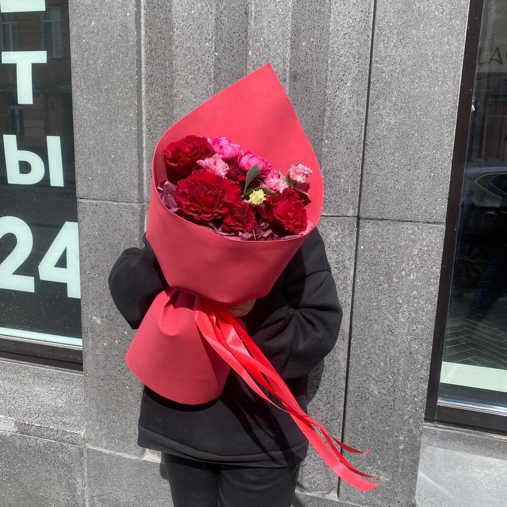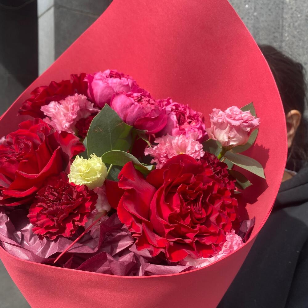Гвоздики, Лизиантусы, Розы, Тюльпаны