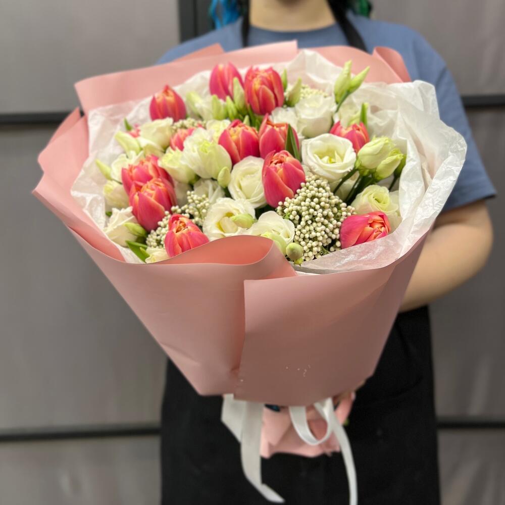 Тюльпан пионовидный – 15 шт.эустома белая – 4 шт.Озотамнус – 4 шт.Тишью – 2 шт.Пленка матовая – 5 шт.Лента атласная – 2 шт.