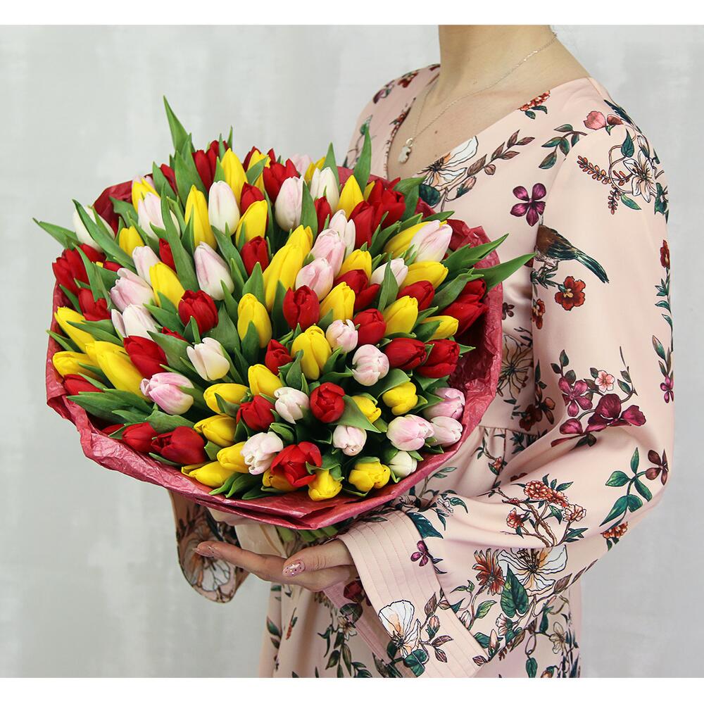 Букет из 101 тюльпана стандарт микс в стильной упаковке