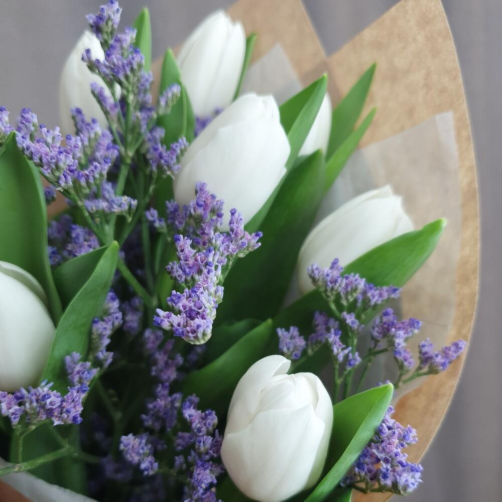 Букет с тюльпанами и лимониумом
