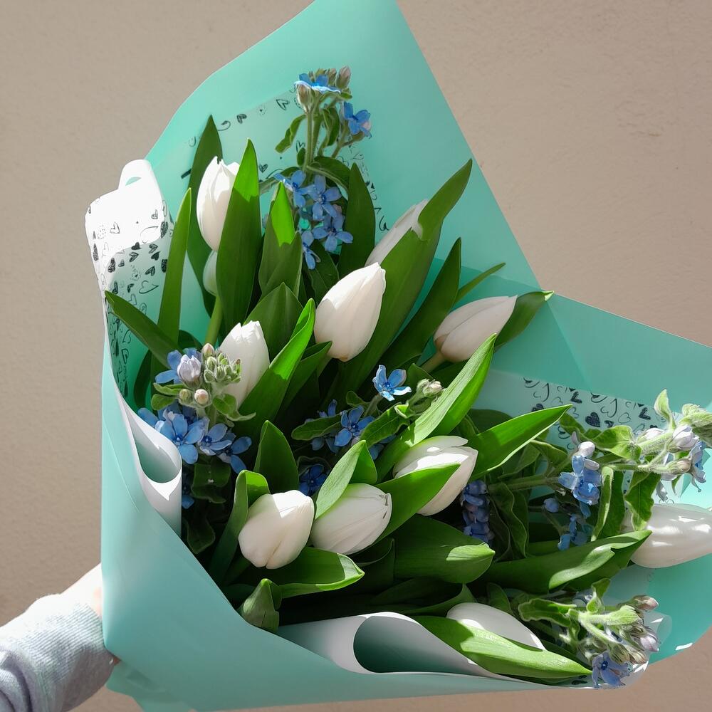 Тюльпан – 11 шт.Оксипеталум – 5 шт.Упаковка дизайнерская – 3 шт.Лента атласная – 2 шт.