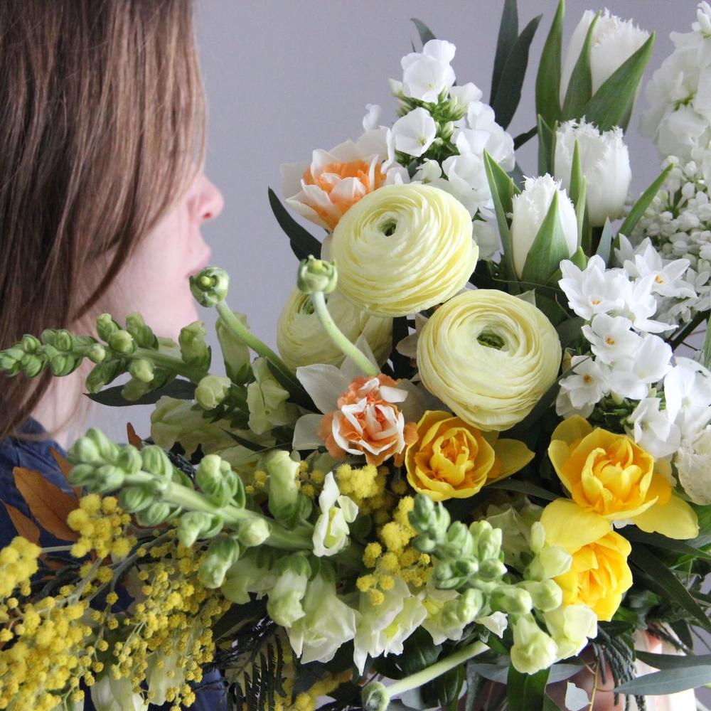 Мимоза – 2 шт.Ранункулюс – 3 шт.Нарцисс – 7 шт.Сирень – 2 шт.Маттиола – 2 шт.Львиный зев – 3 шт.Флокс – 2 шт.Тюльпан – 5 шт.Эвкалипт – 6 шт.Эвкалипт стабилизированный – 1 шт.Лента атласная – 2 шт.