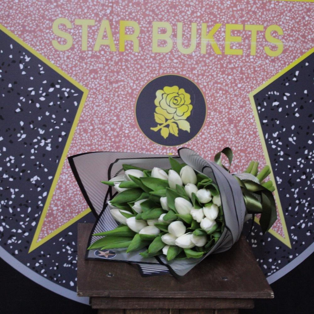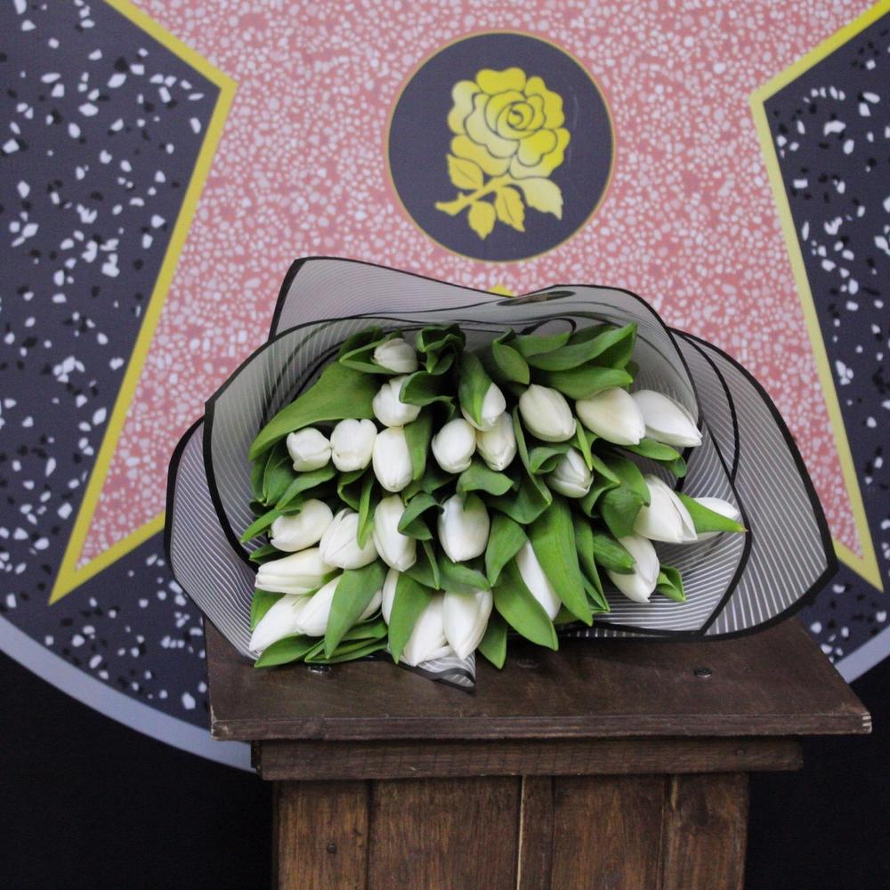 Лента атласная – 2 шт.Тюльпан белый (голландия) – 25 шт.Пленка дизайнерская – 2 шт.
